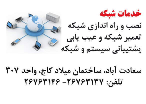 شرکت رایان پشتیبان تعمیرات کامپیوتر، لپ تاپ، شبکه و پرینتر سعادت آباد و شهرک غرب تعمیرات و نگهداری انواع سیستم های کامپیوتری ، نصب ویندوز ، آنتی ویروس و تمامی نرم افزارهای کاربردی نصب و راه اندازی شبکه پشتیبانی و نگهداری شبکه فروش انواع سرور و Workstation Server طراحی انواع وب سایت داینامیک و استاتیک ارائه پرینتر و کارتریج ارائه قطعات و لوازم جانبی فروش انواع laptop , tablet نصب و راه اندازی شبکه های کابلی بر اساس ساختار utp , sftp نصب و راه اندازی کابل کشی ups و ...... نصب و راه اندازی دوربینهای مداربسته تلفن: 26763137 - 26763146 تلفن ثابت 02126763137 02126763146 آدرس