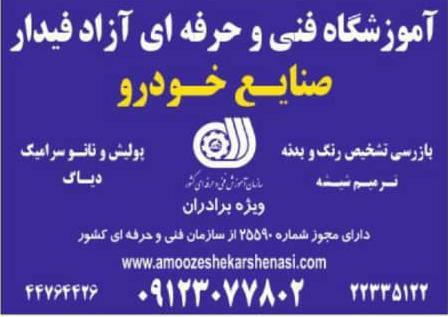 آموزش خصوصی ,مشاوره و کارشناسی بدنه خودروهای ایرانی و خارجی توسط تیم حرفه ای آموزشی فقط جهت افرادی که به این حرفه علاقه مندند. زمینه کاری پس از آموزش تأسیس مرکز کارشناسی اتومبیل که حرفه ای کاربردی و پردرامد میباشد و یا فعالیت در امر خرید و فروش اتومبیل خواهد بود. سرفصل های آموزشی شامل شاسی خودرو و آسیب های وارده,تعویض اتاق و یا قطعات خودرو ,رنگ شدگی مجدد اتومبیل دو تکه,اصالت خودرو سقف و ستون و کلیه آسیب های وارده به خودرو خواهد بود .ضمنا کلیه آمورشها جهت تأسیس مرکز,نور پردازی,صدور برگه کارشناسی دریافت.گواهینامه از سازمان فنی و حرفه ای کل کشور ,دریافت پروانه کسب و .......داده خواهد شد لطفا جهت کسب اطلاعات بیشتر با 09123077802 02122335122 02144769836 تماس حاصل فرمائید تشکر