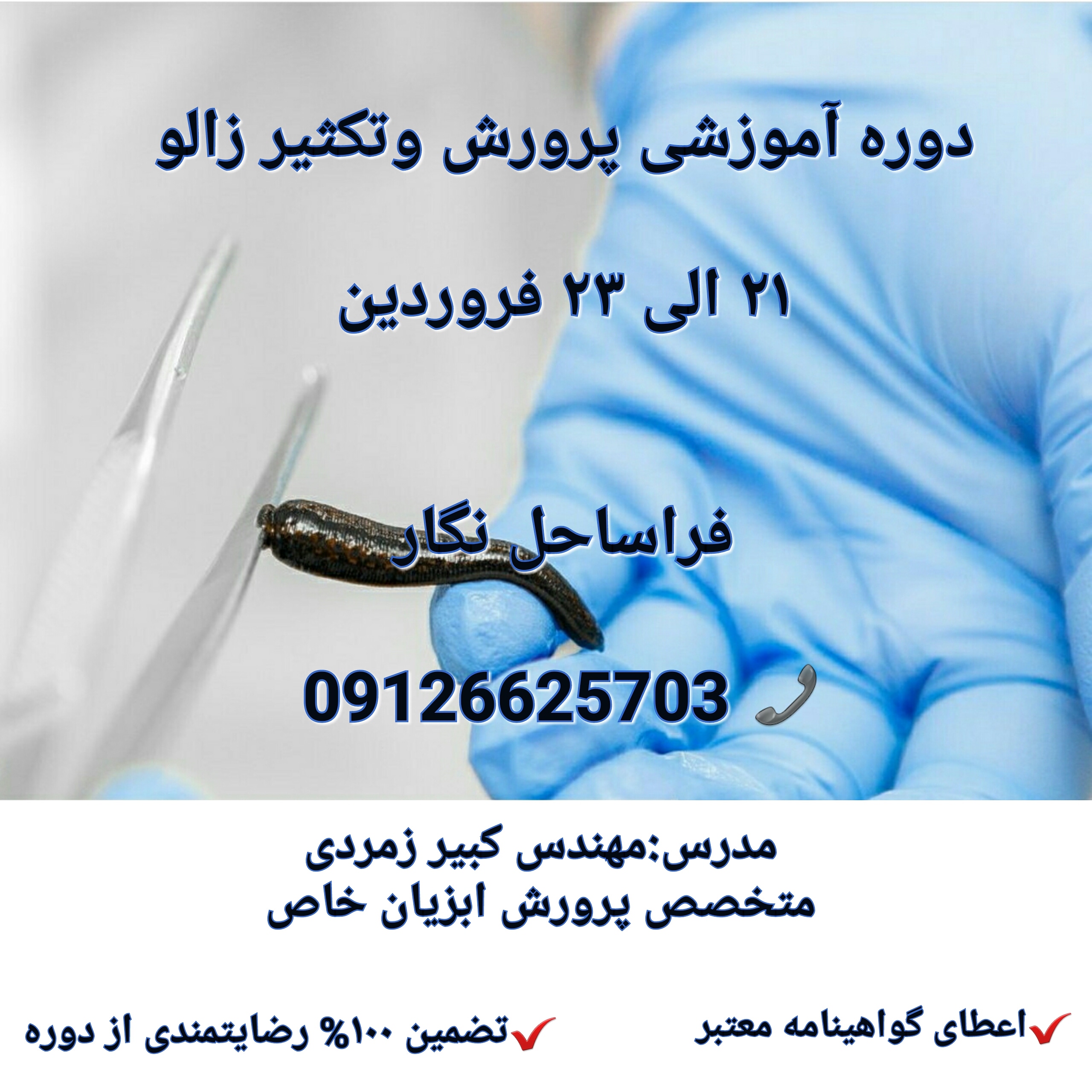 دوره آموزشی پرورش زالو زمان برگزاری : جهت اطلاع از تاریخ برگزاری تماس بگیرید 09126625703 شهریه : 500 هزار تومان در این دوره شما گام به گام با نحوه راه اندازی جدیدترین سیستم بهینه پرورش زالو آشنا خواهیم کرد. بطوری که پس از پایان دوره قادر به مدیریت یک سایت پرورشی باشید. تمام نکات علمی و کاربردی جهت مدیریت یک سایت آبزی پروری را به شما آموزش خواهیم داد. این نکات تماما بر اساس تجربیات عملی و علمی بوده و در هیچ کتاب و یا سایتی نگارش نشده . تضمین ۱۰۰ درصد رضایت مندی شما پس از پایان دوره تدریس این دوره زیر نظر کارشناس خبره شیلات صورت میگیرد. ❌ظرفیت محدود سرفصل تکثیر و پرورش زالو طبی نگهداری زالو بررسی عوامل محیطی (دما،نور،آب) نحوه تغذیه و رشد عوامل محیطی موثر در پرورش نیمه صنعتی و صنعتی زالو نحوه کوکون گذاری ،تغذیه نحوه تبدیل زالوی لارو تا مولد نحوه بسته بندی ارسال محصول تکنیک های فروش ،بازاریابی قوانین و مقررات جهت اخذ مجوز ☜مشاوره خدمات پشتیبانی در طول دوره پرورش ☜ مساعدت جهت اخذ مجوز ☎️علاقمندان جهت مشاوره و ثبت نام ، با شماره 09126625703 تماس بگیرید ✅اعطای گواهینامه معتبر جهت اخذ مجوز و تسهیلات ☱☜ اگه قصد سرمایه گذاری در این کسب و کار را دارید جهت شرکت در این دوره شک نکنید. ☎️علاقمندان برای ثبت نام و کسب اطلاعات با شماره 09126625703تماس حاصل فرمایند. اعطای گواهینامه معتبر مورد تایید سازمان شیلات ( جهت استعلام گواهینامه با سازمان شیلات تماس بگیرید)