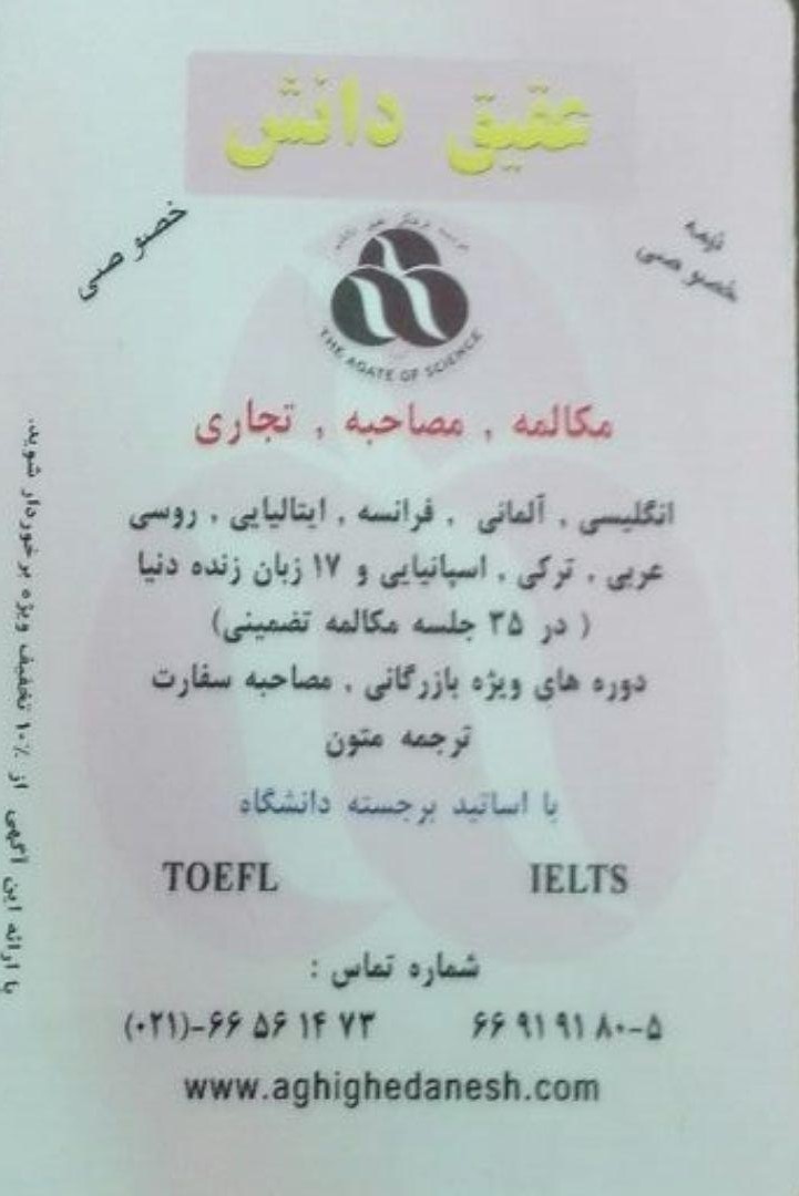 ● شتاب وب : http://shetabe.com/?Ad=730 ● شخصیت : حقوقی ● نام واحد تجاری : موسسه عقیق دانش ● آگهی دهنده : -بدون هویت- -بدون هویت- ● همراه 1 : 9121549735 ● تلفن 1 : 66561377 ● تلفن 2 : 5-66919180 ● آدرس ایمیل : info@aghighedanesh.com ● آدرس سایت (اول) : http://www.aghigedanesh.com ● آدرس سایت (دوم) : https://www.instagram.com/aghigdanesh/ ● آدرس سایت (سوم) : https://telegram.me/aghigdanesh ● آدرس : تهران - تهران - میدان انقلاب ابتدای کارگر جنوبی کوچه مهدی زاده پلاک 1 طبقه اول واحد1