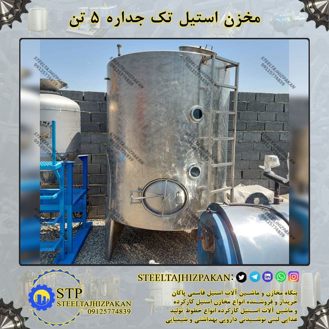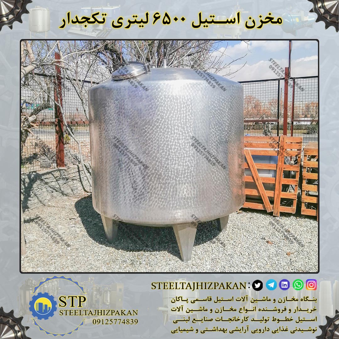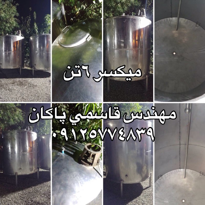 مخزن/میکسر 6000 لیتری استیل 304 ورق سه میل است همزن از بالا شفت موجود است و بدون موتور گیربکس است دوش سی آی پی دارد خروجی از مرکز کف عدسی است منهول از بالا است آبنما مدرج است قطر 1.90/ارتفاع مخزن 2.20/ارتفاع کل با پایه 2.70 است وزن 600 کیلو است وضعیت داخل مخزن نو است و همچنین بدون استفاده است موجودی 2 عدد است مهندس قاسمی پاکان 09125774839 (بنگاه مخازن و ماشین آلات استیل قاسمی پاکان)(استیل تجهیز پاکان) (((مخازن استیل تجهیزات و ماشین آلات استیل لبنی نوشیدنی غذایی دارویی آرایشی بهداشتی شیمیایی جهت بازدید موجود میباشد)))