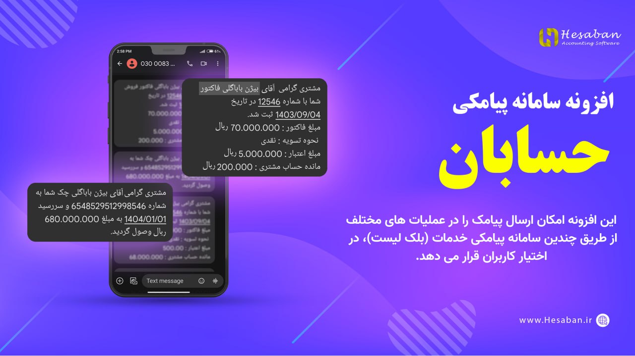 ⭐️ نام محصول : افزونه سامانه پیامک نرم افزار حسابان